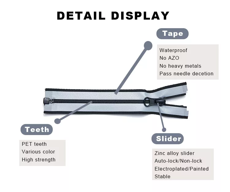 TRC waterproof nylon zipper uses high-strength polyester tape and premium nylon teeth, covered with a professional waterproof layer (TPU/PU), effectively preventing rain and moisture penetration.
